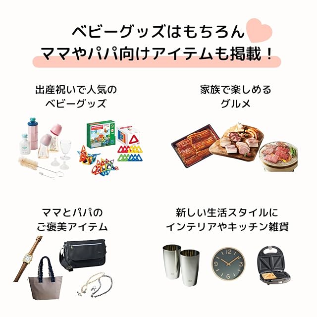ベビーグッズはもちろんママとパパ向けアイテムまで幅広いラインナップから選べます
