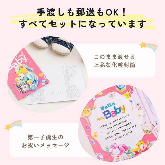 出産お祝いのメッセージカードと選べるギフト一体型のおしゃれなカードギフトです