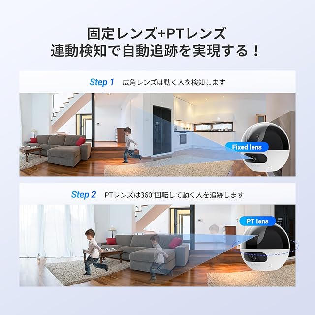 【デュアルレンズ×360°カバー】固定レンズ+PTレンズによる360度カメラ機能で死角なく屋内全域を一発撮影。デュアルカメラ1+1>2の鮮明映像で防犯カメラ 屋内としても安心です。