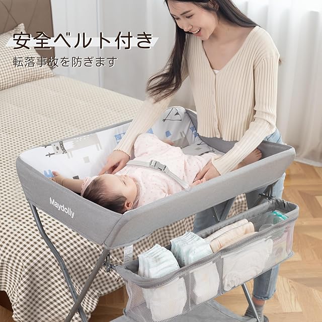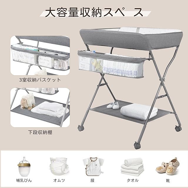 【4-in-1多機能】:物干しとしてもご利用可能;サイドと底部に収納スペースが2箇所あり、おむつ、タオル、その他のアクセサリーに簡単にアクセスでき;赤ちゃんと遊びもラクラク;マッサージやべびーケアがオススメです!