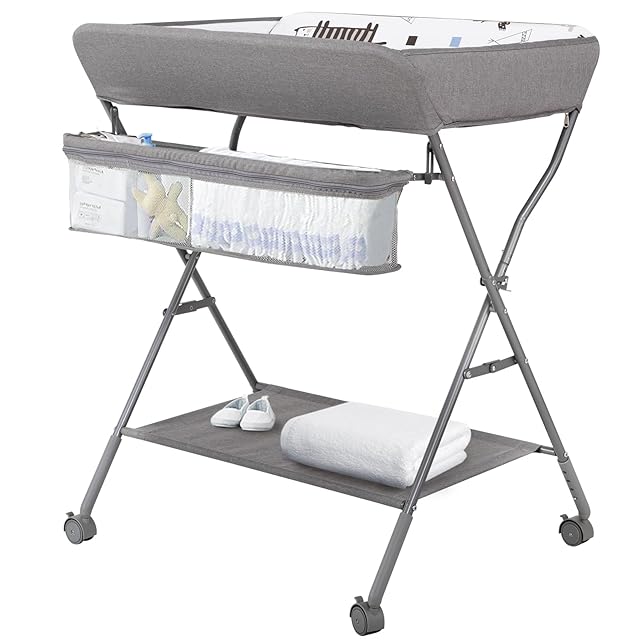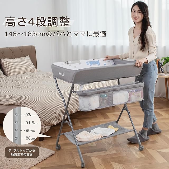 Feemomオムツ換え ベビーケア おむつ交換台 折りたたみ SGS認証済 高さ調節 マッサージ ベビーベッド 育児用 おむつテーブル 大人の腰痛対策 ポータブル収納便利 おむつ取替テーブル 安全ベルト サイドラック 収納棚 キャスター付き おむつ台安全規格、欧州安全規格EN1888をクリア(グレー)
