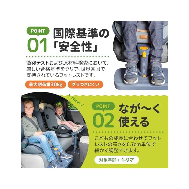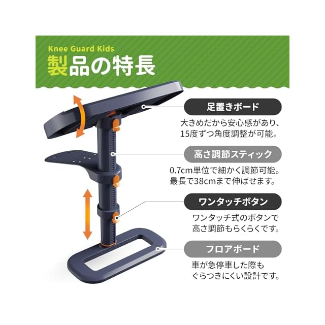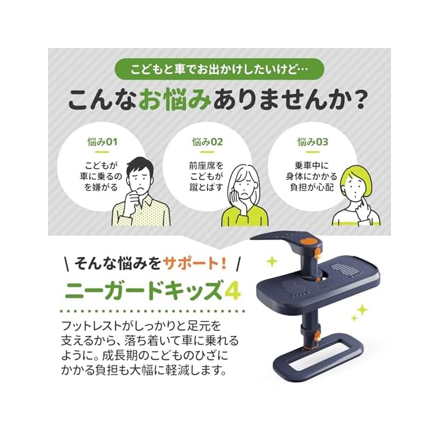 使用上の注意点:ISOFIX対応・非対応を問わず、あらゆるタイプの車に簡単に取り付け可能。サポートレッグ付きのチャイルドシートには対応しておりません。ニーガードキッズ4を安全に使用するためには、前方座席との間に最低20cmのスペースを確保してください。(足置きボード寸法:幅38cm × 奥行20cm)