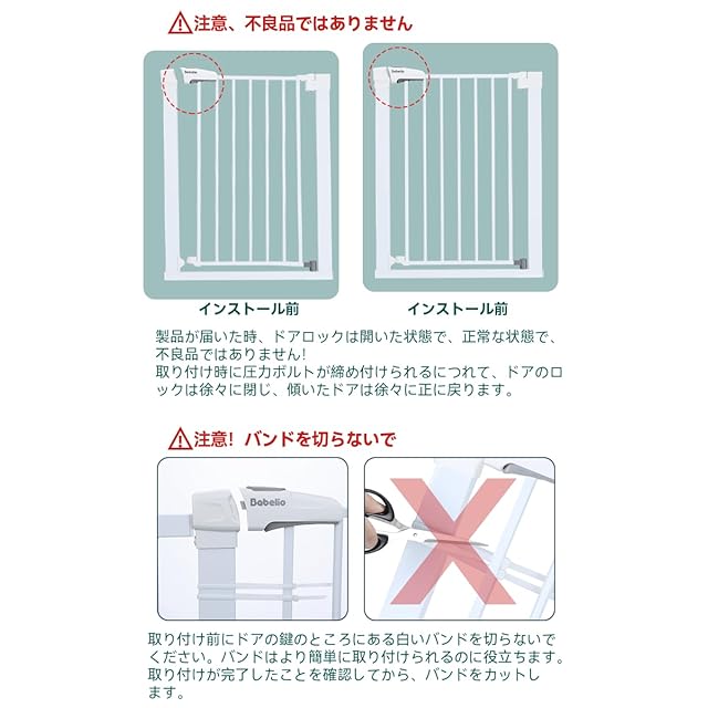 【ヒント】赤ちゃん ゲートは取り付ける前に、ハンドルロックとドアフレームの間に隙間があります。これは不良品ではなく、破損による曲がりでもありません。取り付け後、この隙間は取り除かれます。