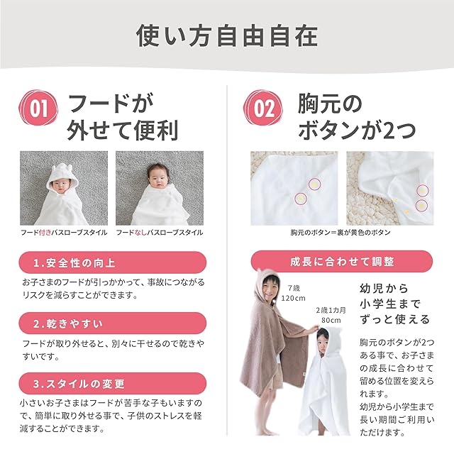 【フードが取り外し可能】フードが取り外せるので、小さいお子様の事故リスクが減ります。また、別々に干せるので乾きやすく、普通のタオルとしても使えます。【胸元のボタンが2つ】胸元のボタンが2つ付いているので成長に合わせて調整が可能です。大きくなったらプールでもお使いいただけます。