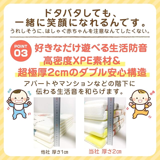 【好きなだけ遊べる防音性能】 高密度XPE素材と超極厚2cmのダブル安心設計でアパートやマンションなどの階下に伝わる生活音を和らげます。