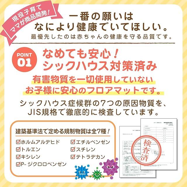 【シックハウス安全検査済】 シックハウス症候群の7つの原因物質をJIS規格で徹底的に検査しています。有害物質を一切使用していないお子様に安心のベビープレイマットです。