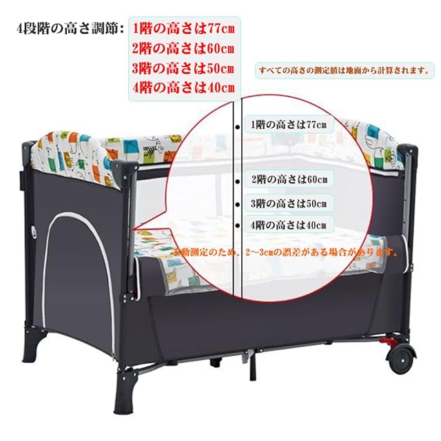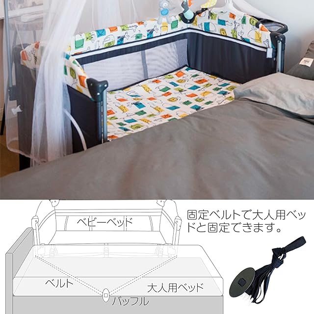 多機能セット内容:1ベビーベッド本体 2便利なおむつ交換台、ベッドから取り外し可能です 3おむつ、哺乳瓶などのようなもの置き台 4オルゴールとおもちゃラック 5横揺れモード 6大人のベッドと固定用ベルト 7静音キャスター付き、自由に移動 8マット9収納袋