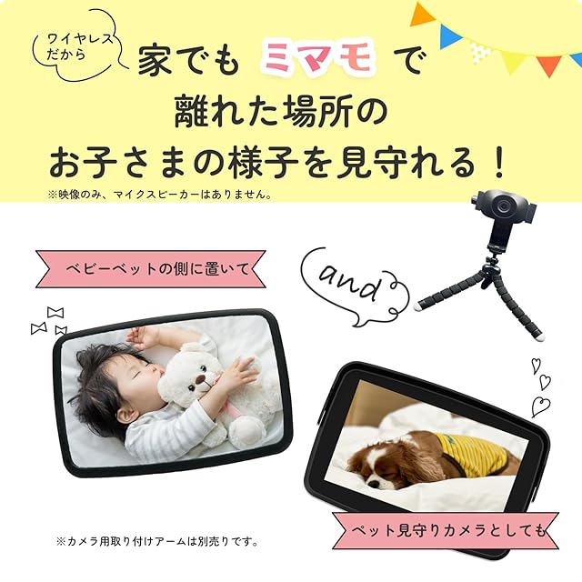 【ご自宅でも見守りカメラとしてお使い頂けます】 車載用としてだけでなく、ご家庭でも見守りカメラとして活用できます。 家事をしながら、離れた部屋にいても専用モニターでお子さまやペットの様子を簡単に確認可能! ベビーベッドのそばに置いて赤ちゃんを見守ったり、ペットの見守りカメラとしても最適です。 ※映像のみ。マイク・スピーカーはありません 家庭用には、別途カメラ用取り付けアームとUSBコンセント(2個セット)のオプションをご用意