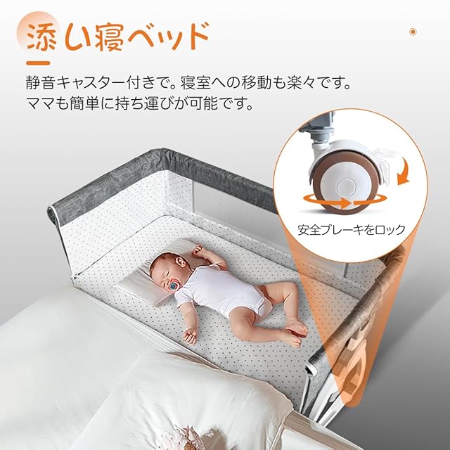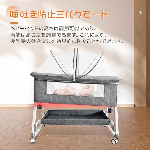 【高さ調節可能】高さ6段階調節可能で、市場に出回っているベッドタイプの99%と互換性があります。キャスターの安全ブレーキをロックする、お子様を快適な環境で眠らせてあげられます。ーベッドは斜めの調節可能で、新生児に対してミルクの吐くことを防ぐことができます。