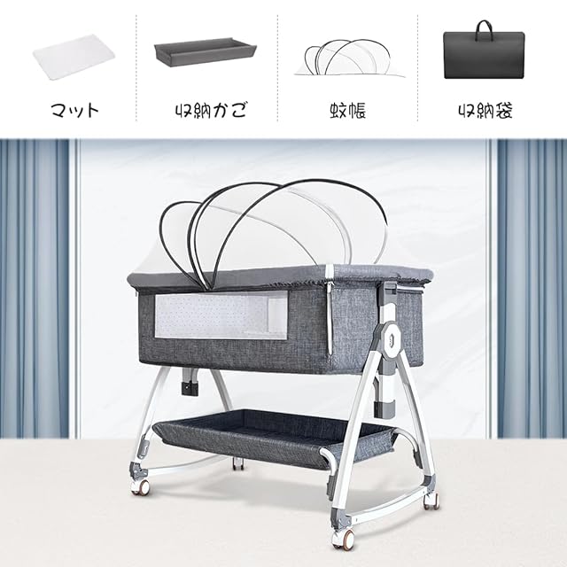 【ゆりかごに変身可能】キャスターを調整して、すぐにゆりかごになって、約10度のわずかな揺れで赤ちゃんはすぐに眠りにおちます。下に収納かごつき、おむつとおもちゃなどを入れて簡単に収納できます。蚊帳は取り付けまたは取り外しができ。周りのフェンスはメッシュで、横からでも赤ちゃんの様子を確認することができるのでパパママも安心。