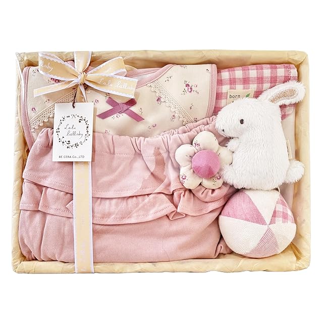 セット内容: 花柄スタイ、フリルパンツ、背中の汗取りパット、うさぎ型ぬいぐるみラトル、ボール型ラトル、花リストラトル、竹カゴ付き、ブランドリボン付き、白色お手提げ用紙袋付き、お祝いコメント付きショップカード付です。