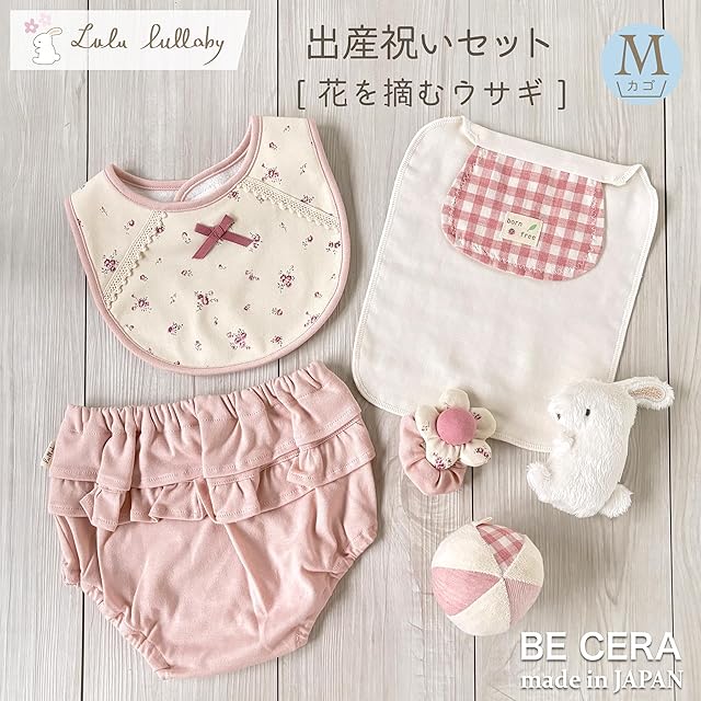 Lulu lullaby ルルララバイ ビセラ製作所 出産祝いセット 花を摘むうさぎ Mカゴ ピンク 6点セット 日本製 ベビーギフト
