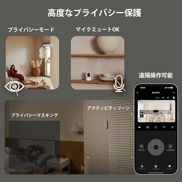 【プライバシー保護】物理的なレンズカバーが付いており、必要に応じてレンズを覆ってカメラの視野を遮ることができます。カメラのオン/オフを自由に切り替えることもできます。スマホ画面で覆いたいエリアをカスタマイズすることもでき、高度なプライバシー管理が可能です。また、音声録音やマイクは、アプリ内で手動または自動的に無効化することができます。Apple HomeKitとのHomeKitセキュアビデオもサポートしており、データの盗難から保護し、自宅のプライバシーを守ります。