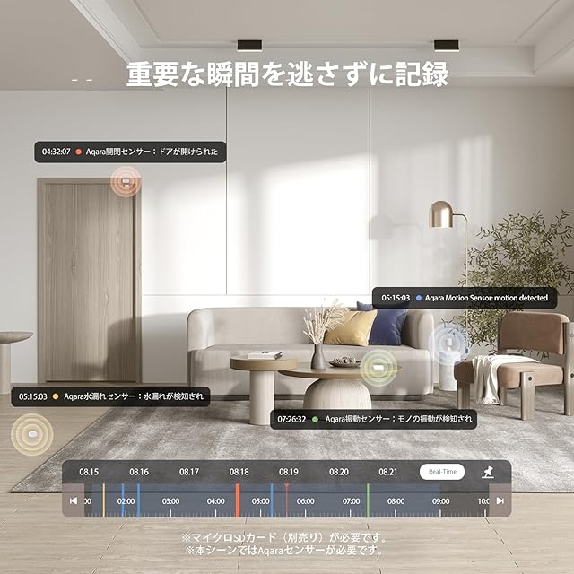 【防犯記録およびデータ保存】重要な瞬間を逃さずに記録するため、特定の時間帯には色付きで表示されます。また、Aqaraセンサーと連携しているため、留守中でも本製品が自動的に特定のイベントを記録します。24時間暗号化されたクラウドストレージが無料で提供されています。512 GBのmicroSDカード(別売)によるストレージのサポートも可能です。また、SMB 3.0 NASストレージにもバックアップすることができます。