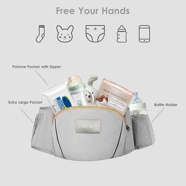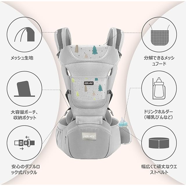 【十分な収納力】 DEBARKのヒップシート(抱っこ紐)では収納にもフォーカスをあてており、左サイドにはポケットティッシュやハンカチ、おかしといった小物を楽々と収納することができます。 またDEBARKのヒップシートでは右サイドのポケットには、哺乳ビンがすっぽりと入る設計となっており、 ちょっとしたお出かけにも赤ちゃんを連れていきやすい構造となっています。【安心設計】 ただ赤ちゃんを抱っこするだけではなく、いかに快適に抱っこができるのかを追求し、製造いたしました。ウエスト安全バックルとマジックスナップは最も重要な安全部品です。これにより、赤ちゃんはより安全に保たれます。