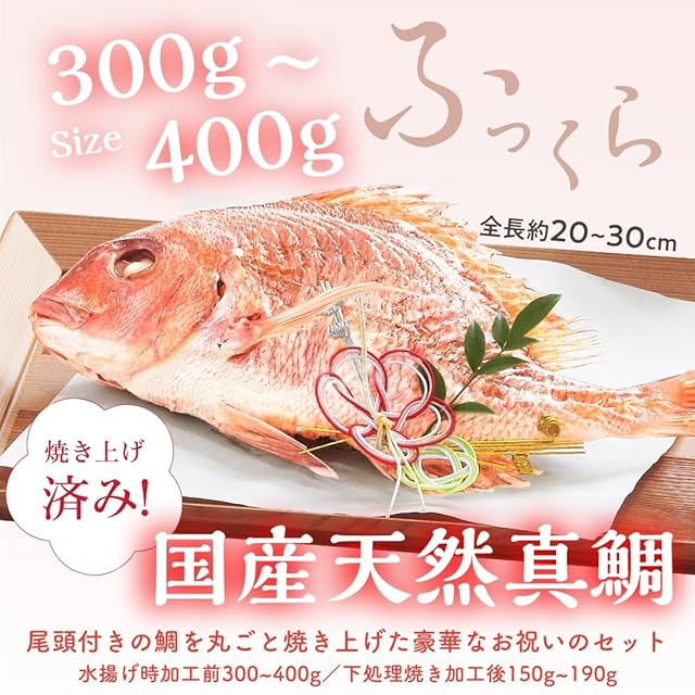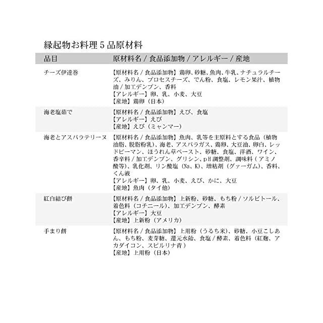 ●祝い鯛姿焼き(水揚げ時加工前300~400g/下処理焼き加工後150g~190g)×1、●縁起物お料理5品(①海老塩茹で、②チーズ伊達巻、③海老とアスパラのテリーヌ、④紅白むすび餅、⑤手まり餅)