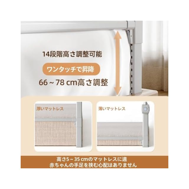 【高さが自由に調節可能】ボタンを押すだけで14段階調節可能な最新バージョンです。66cmから78cmまでの広い調節範囲なのでご利用されるマットレスの高さと合わせて一番良い高さを選びましょう。親子の安全を最大限に追求しておるため、弊社の本製品は従来品と比べて高さを(折り畳み時の高さ)24cmから30cmまで改良しております。