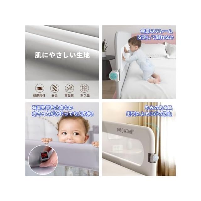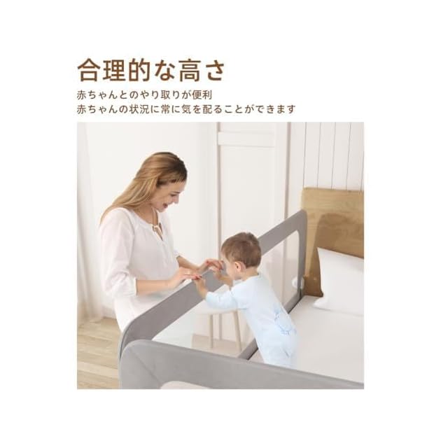 【上質な素材】棉100%で作られるオックスフォード生地は自然な素材感があり、お肌にとても優しいです。真ん中の部分は3Dメッシュ生地で縫い込まれるので通気性が良くて暑い日にも蒸れにくく快適です。ベッドフェンス全体には無毒・無臭で環境にやさしい安全素材が使われているので赤ちゃんが触ったり噛んだりなどしても安心です。フレーム部分はハイクオリティーの炭素鋼を採用しており、強度が高くて耐久性も優れているため、オールシーズンで自由に使用できます。その上と両側のパイプは厚みと弾力性のある高密度NBR素材できちんと包まれているので、遊びの時でも寝る時でもしっかり赤ちゃんの安全を守ってくれます。