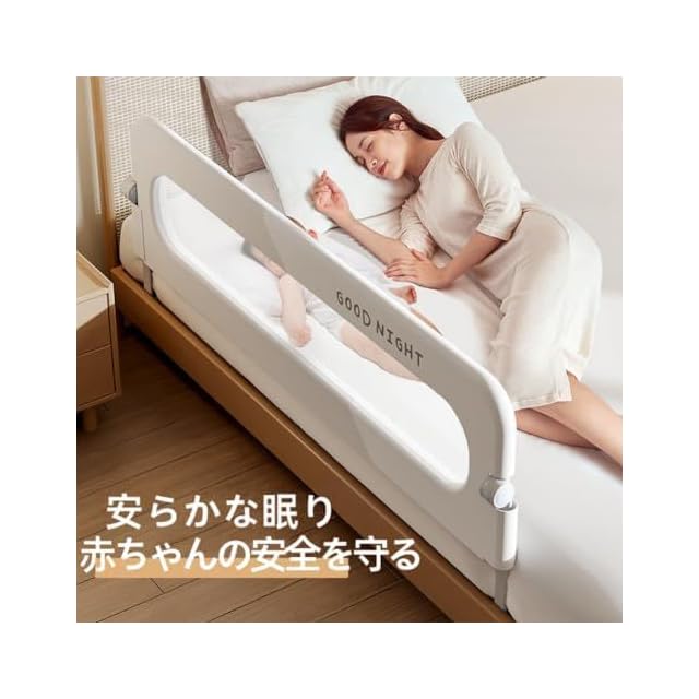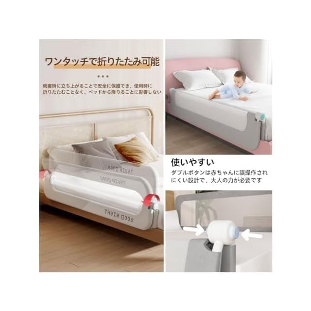 【ワンタッチでの折りたたみ式・収納に便利】サイド側に設置されるボタンを押すとベッドフェンスの上半部を180°折りたたむことが可能です。哺乳や親子遊びの時などに赤ちゃんの抱き上げが不都合なくできます。寝るときは折り畳まれる部分を持ち上げれば簡単に固定できるので(ガチッとする音がします)、赤ちゃんとの添い寝する際に転落など危険なことをきちんと防ぎます。コーナー部分は丸くデザインされており、親子の安全の確保に最大限に配慮しております。折りたたみ式なのでベッドフェンスを使わない時に場所をとらなく便利に収納できます。
