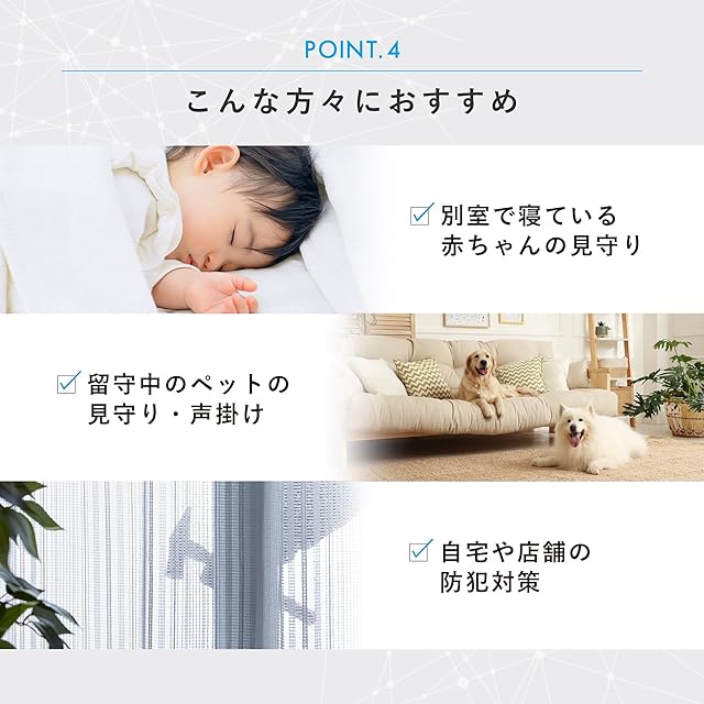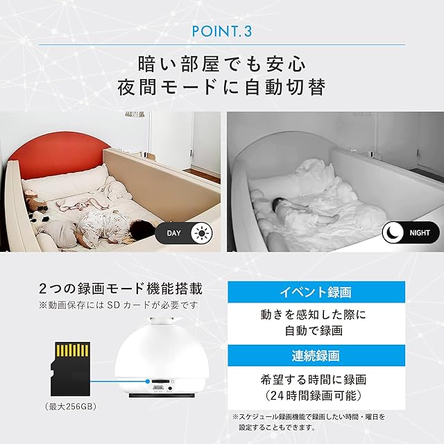 【製品概要】天井・壁・床などいろんな向きで設置可能なみまもりカメラです。 スマートフォンの操作によりカメラを回転させることで360°の視野を確保することができるので、必要な場所をどこからでも確認することができます。夜間モードへの自動切換( IRナイトビジョン機能:自動)搭載で部屋が暗くても安心です。 天井に設置した場合は設定にある基本機能設定で上下を変更することができます。 ※アプリ画面の右上<・・・>➡<基本機能の設定>➡<画面フリップ>をon(丸を右側にスライドさせると背景が緑になる)の設定で画面が反転します。