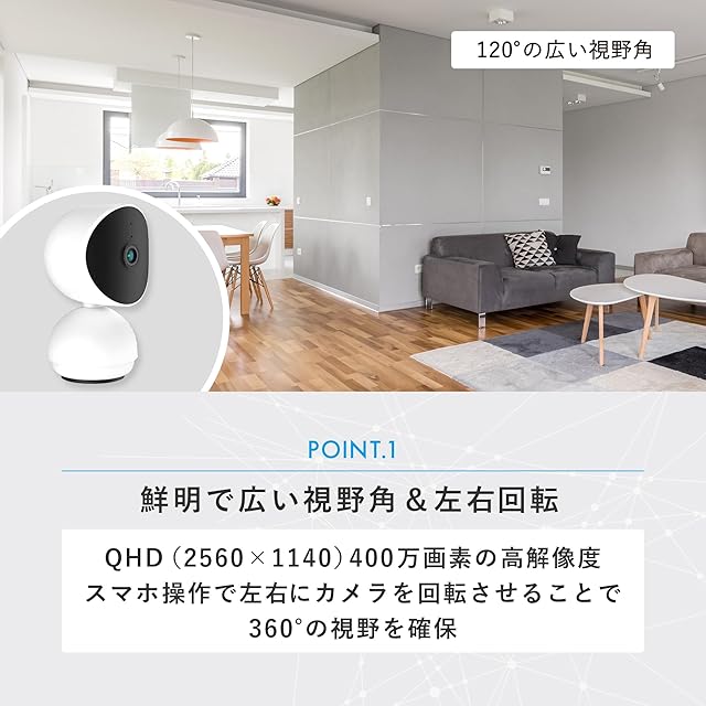 QHD(2560×1140)高解像度の400万画素でより広角な視野と鮮明な画像を提供します。夜間モードへの自動切換(IRナイトビジョン機能:自動の設定)搭載で部屋が暗くても安心です。 (IRナイトビジョン機能:【ON】の場合は周囲の明るさに関わらずIRナイトビジョンモードでの動作となり、画面が常時白黒になります。【OFF】の場合は周囲の明るさに関わらず、画面が常時カラーになります。周囲が暗い場合には、画面が暗くなることがあります。) AES128を使用しており高セキュリティを確保しています。