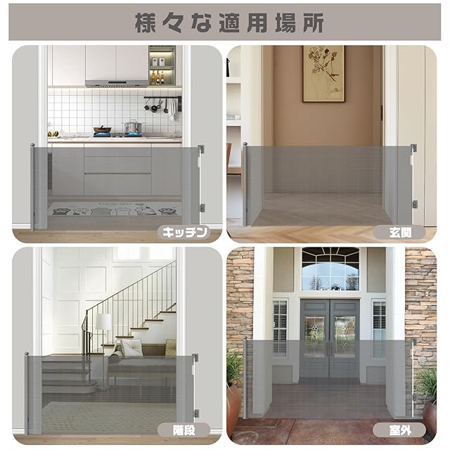【透けるメッシュ素材&通気性抜群】この格納式ベビーゲーはエアコンの冷房や暖房をしっかり通すメッシュ素材を採用し、ロール部分は柔かく破れにくいPVC素材で赤ちゃんも安心、衝撃性や耐久性も抜群です。圧迫感のないメッシュ素材、ママや赤ちゃんもお互いの姿が見えて不安になりません。無味無毒かつ柔らかく丈夫なゲートは、ぶつかっても痛くないし、安心です。耐久性のあるメッシュは、ペットの爪にも耐えられる上質なデザイン。メッシュ伸縮ドアは、幼児用ゲートとペット用ゲートの両方としておすすめです!