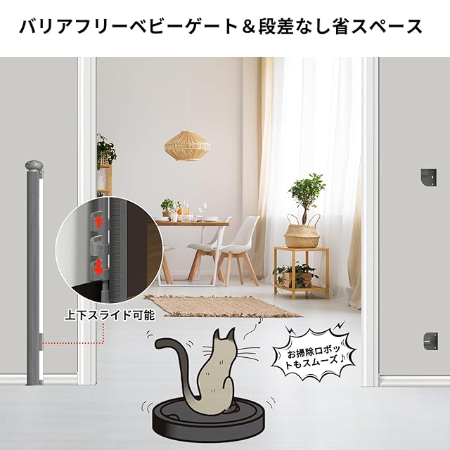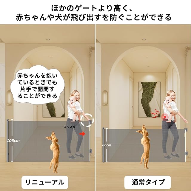 【赤ちゃん&ペットに最適】高さ105cmハイタイプロールゲートなので、子供が乗り越えるや猫が飛び越えるが防止に!猫や犬でも簡単に登れない高さハイタイプは大きなペットにも対応します。最大200 cmまで伸びる超ワイド伸縮ロール式ベビーゲートです。さらに使用しない場合は完全に引き戻すことができる、収納が便利で省スペースな折りたたみ式ロールベビーゲート。鉄製ベビーゲートと異なり、このリニュアル赤ちゃんやペット用巻き取り式伸縮型ゲート足元には何も残りません、すっきりバリアフリーベビーゲート、つまずく心配もない、ペット用ゲートとしてもご使用いただけます、脫走防止にも効果的~赤ちゃんやペットがいる家庭に適しています。