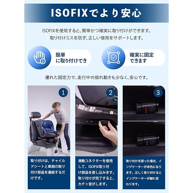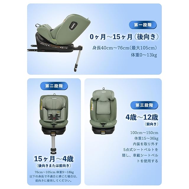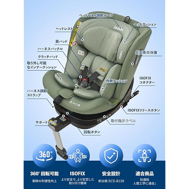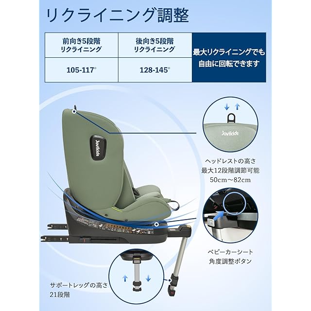 360°回転:Jovikidsの子供の座席は360°で回転できます。これは、赤ちゃんが乗り降りするのに便利です。前向き取付と後ろ向き取付との転換はわずか数秒でできます。シートの傾斜角度は、複数のギアで調整できるため、赤ちゃんは座っているか横になっているかにかかわらず快適になります。