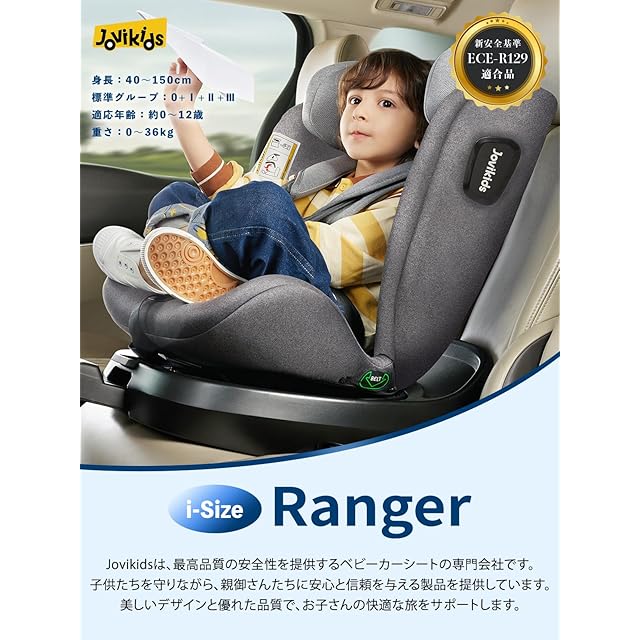 Jovikids チャイルドシート ISOFIX、 360°回転式 i-Size R129適合 新生児ベビーシート、0か月~12歳頃ジュニアシートとキャノピー、ロングユースコンパクト、調整可能なライ角