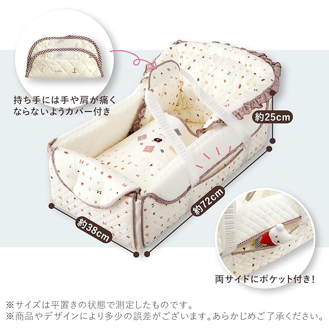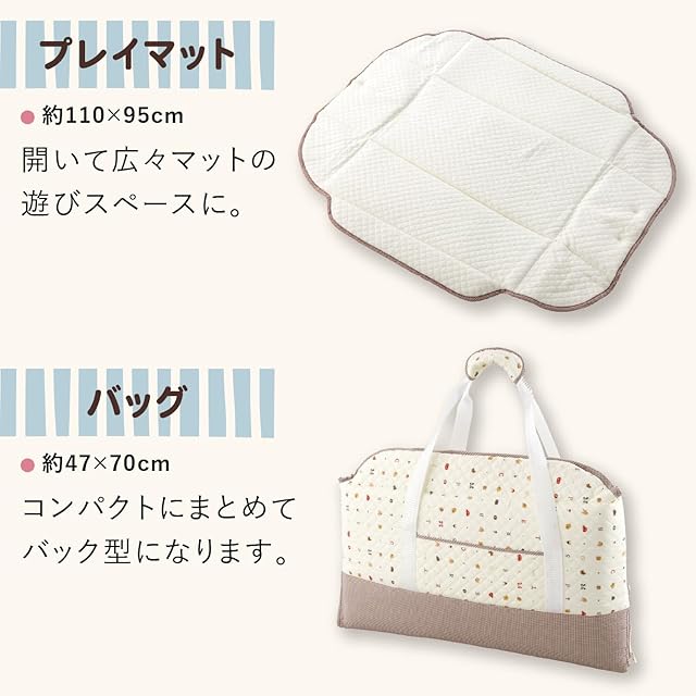 【製品仕様】■サイズ:本体 約38(横幅)×72(奥行)×25(高さ)cm、バッグ時 約70×47cm、マット時 約95×110cm ■素材 生地:綿100%、中わた・キルティングわた ポリエステル100%、持ち手・底板 ポリプロピレン100%