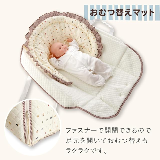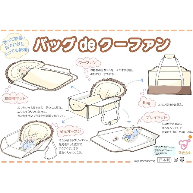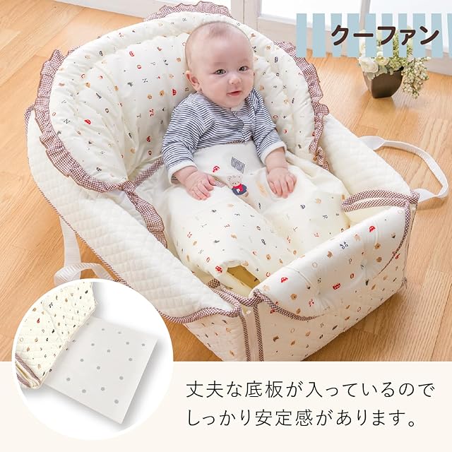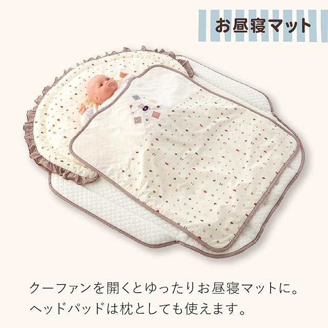 お昼寝マットとして、クーファンとして、プレイマットとして、様々なシーンで活躍する便利なアイテムです。お客様からの「こんなものが欲しい」という声を実現しました。 折りたためばバッグになるので持ち運びもらくらく。わた入りのやわらかい素材なので赤ちゃんも心地よく、丸ごと手洗いもできるので清潔で安心です。