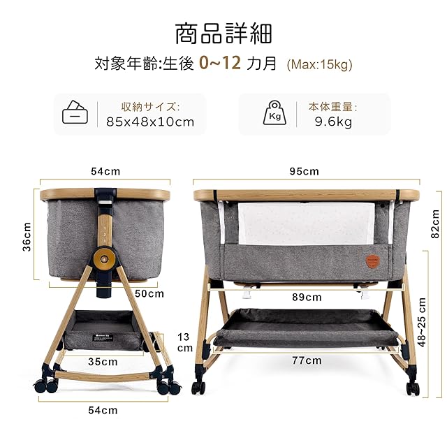 ベッドサイド寝台&クレードル - 通気性のあるメッシュ窓で赤ちゃんをしっかり見守れる、便利で使いやすいサイド寝台またはクレードル。赤ちゃんと両親にとって非常に便利です。このベビーベッドは15kgの重量まで対応可能で、適用範囲は0〜12ヶ月です。