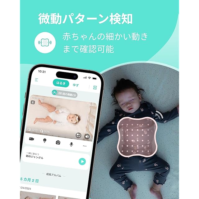AI カメラと微動センサーの連動: ベビーセンサーパッドがどのような小さな動きも感知できなかった場合は、CuboAi スマートベビーモニターがAI画像認識で赤ちゃんがベッドにいるかどうかを判断し、必要に応じて通知アラートを発信します。安心・快適なご利用のために、Wi-Fiのダウンロード/アップロード速度は5Mbps以上であることが必要です。