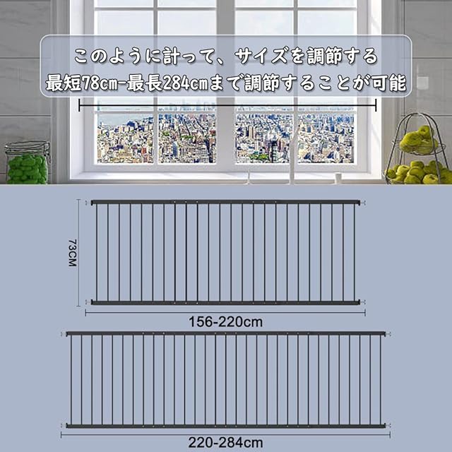 【窓フェンス】高さ73cm、幅は78-284cm対応です。窓フェンスの枚数を組み合わせによって、幅を調節することができます。お引っ越ししても、再利用ができます。大人の体重にも耐えられ強度でございます、ご安心ください。