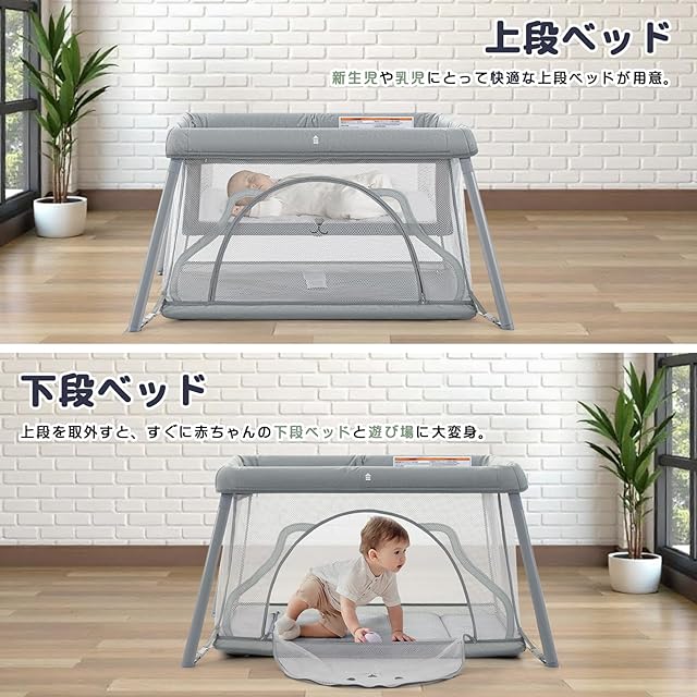 【ベビーベッド&プレイヤードの一体化設計】上段と下段はどちらでもご利用可能な構造に設計され、ベビーベッドとして使えます。上段を取り外すと、すぐにプレイヤードとして大きな遊び空間に大変身。