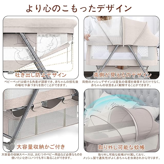 【多機能デザイン】ベビーベッドは傾ける角度が調節でき、赤ちゃんの授乳後の嘔吐や鼻づまりを防ぐことができます。大容量の収納スペースは、おむつやベビー用品など必要なものを、使いたいときにいつでも手に取ることができます。取り外し可能な蚊帳が付属しており、メッシュ製で通気性がよく,赤ちゃんを虫刺されから守ります。