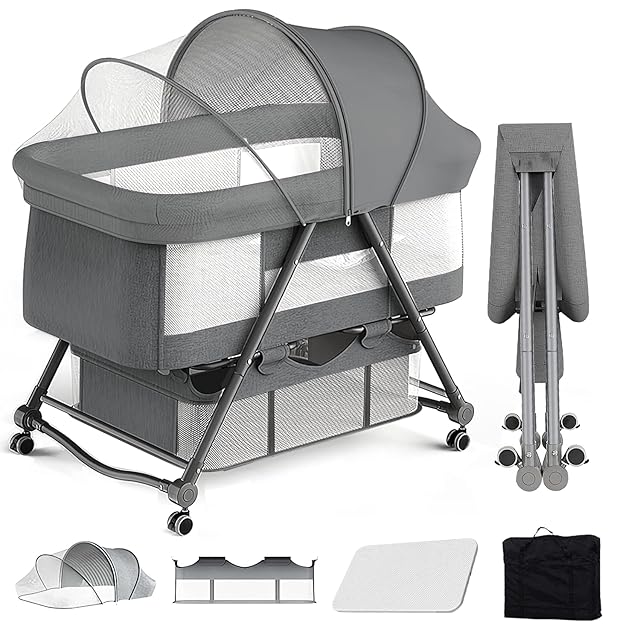 UBRAVOO ベビーベッド ゆりかご ベビーラック 折りたたみ 組み立て不要 収納便利 キャスタ付き 通気 洗濯便利 蚊帳付き・収納袋・マット 新生児ベッド0ヶ月~ (灰色)