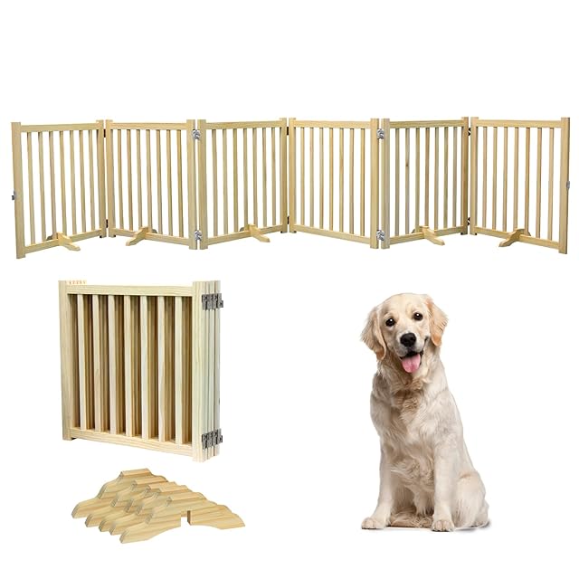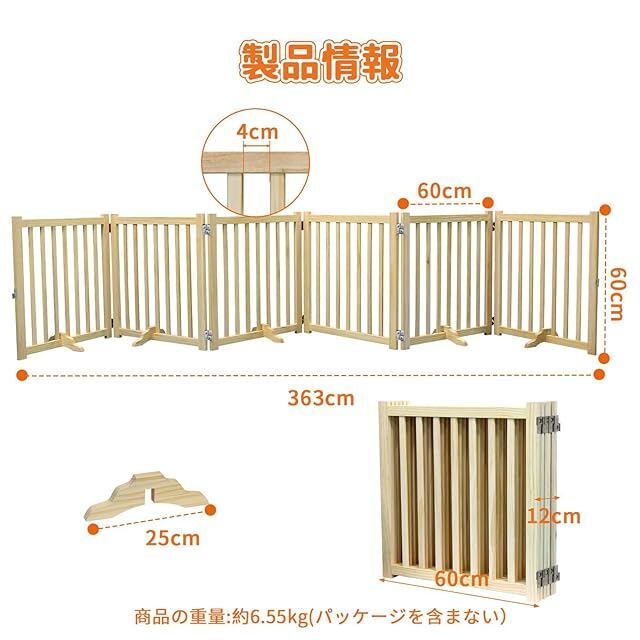 HEEOREV 木製ペットゲート ペットゲート ベビーゲート 犬用ゲート (長さ363cm 、高さ60cm) 折り畳み式ゲート 柵 犬 ゲート 安全柵 猫 ドアフェンス 室内 猫 大型犬 脱走防止 軽量 ペット保護 取り付け簡単 場所を取らない 収納しやすい 省スペース シンプルでスタイリッシュ(6つのパネル)