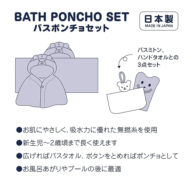 サイズ:バスポンチョ:102×60cm(フード含まず)・ハンドタオル:25×25cm・バスミトン:21×13cm
