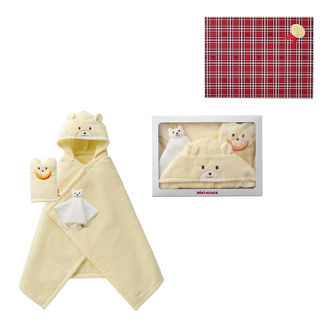 人気の 無撚糸 パイル で、ふんわりとした肌触りの ミキハウス バスポンチョセット です。 バスポンチョ 、 バスミトン 、 ハンドタオル の 3点セット は、ギフト仕様なので、 出産お祝い や プレゼント におすすめのアイテムです。 新生児 ~ 2歳 頃まで長くご使用でき、広げれば バスタオル 、ボタンをとめれば ポンチョ として使えて便利で、 お風呂 あがりや プール の後に便利な mikihouse バスポンチョ セット です。