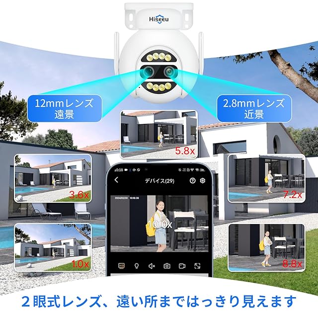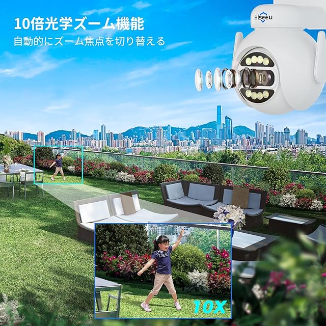 【最新双目機種・二つのレンズ内蔵・10倍光学ズーム搭載】 Hiseeu最新双目機種カメラが登場しました!二重レンズが内蔵され、遠景と近景の切り替えを実現させ、監視範囲が広くなるだけでなく、遠い所までもはっきり見えます!10倍の光学ズーム機能を搭載し、遠いところを拡大してもぼやけられません。普通の防犯カメラより監視視野を広げて、細部まではっきり映ります。レンズの焦点が自動的に切り替わり、360度全方位でお宅の安全を守ります。