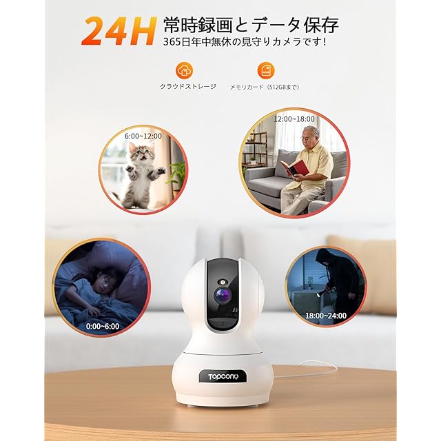 【24時間録画・自動上書き・カード/クラウドストレー対応・ネット切断記憶機能】この屋内用カメラは、最大512GBのカード(別売り)と自動上書き機能に対応して、古いファイルに自動的に上書きしながら録画をするので、メモリ不足を心配する必要はありませんです。24時間常時録画・365日年中無休の見守りカメラです。常時録画だけでなく、モーション/サウンド/人体の検知録画の設定も可能で、モーション/サウンド/人体を検知すると自動に録画開始します。また、クラウドストレー(有料)に対応して、データのバックアップに使えて、データ管理はとてもやすいです。さらに、ネット切断記憶機能を搭載して、ネットワークが一時的に途切れてもこの間のデーターを保存できて録画が続けます。ネット不安定な場合でも重要な情報を逃さないです。(予め24時間録画をオンにして、カード使用する必要