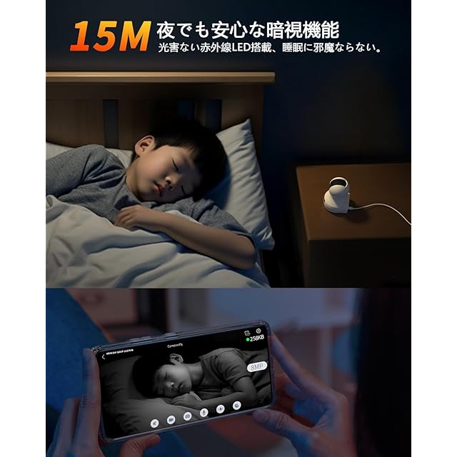 【今まで最高画質800万超高画素・4k赤外線暗視・H.265動画圧縮】Topcony 最新強化版のネットワークカメラは、従来のフルHD解像度の4倍の画素数(4K 3840*2160)を持っていて、非常に高精細、滑らかな映像をしっかり録画し、映像の詳細やテクスチャがより鮮明になり、細かな部分まで捉えることができます。それから、光害のない赤外線ライトとスマートIR-CUT技術により、真っ暗闇でも15mまでくっきり撮影できます。赤ちゃんが夜間に目を覚まして泣いている場合でもすぐに確認することができます。いつでもペットや赤ちゃんの状態を確認できて、安心感を向上させます。また、H.265動画圧縮技術を採用して、H.264に比べて約50%の高い圧縮率を実現しています。同じストレージ容量でより長時間の録画が可能となります。それに、高い圧縮率を実現しながらも、高画質な映像をを録画できます。