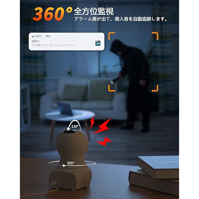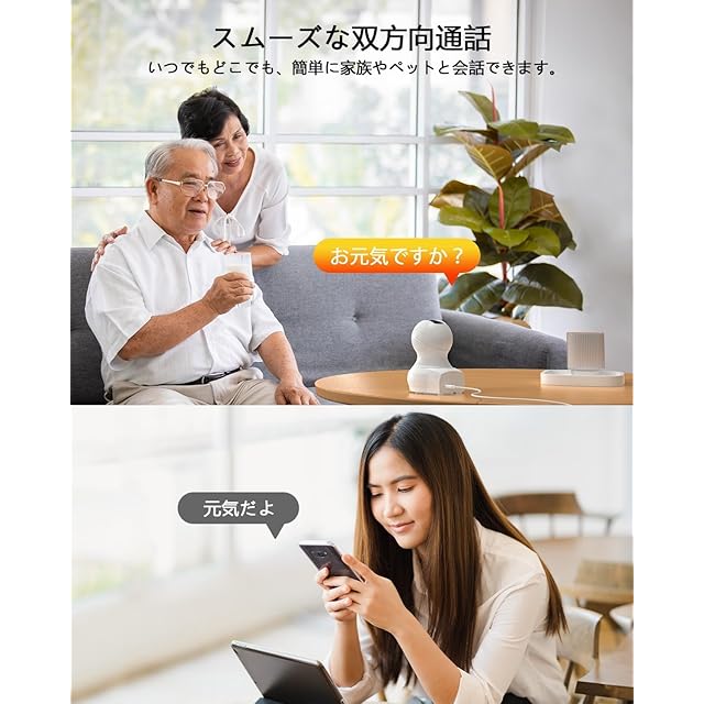 【双方向会話・アレクサ対応・自動追尾&アラーム威嚇】こちらの室内カメラには、高感度集音マイクと上質スピーカーが内蔵されているため、海外や出張先など遠い所でも、リアルタイムでお留守番中の子供や介護のお年寄りと会話したり、ペットに声をかけたり、侵入した不審者へ警告したりする可能です。また、Alexaにも対応し、音声でカメラを操作することができます。例えば、「Alexa、カメラの映像を見せて」と言うことで、カメラの映像を表示することができます。それから、動きを検知すると、自動に対象物を連続的に追跡しながら、リアルタイムでアプリへ警報を送ります。その上に、2種類のアラーム機能を備えています。①手動アラーム:スマホで画面内の異常を見る時に手働に押すとアラームを鳴らして威嚇します。②自動アラーム(予めサイレンをオンにする必要):異常を検知すると、自動にアラームが鳴って威嚇し、不審者を撃退します。空き巣対策に効果的です。