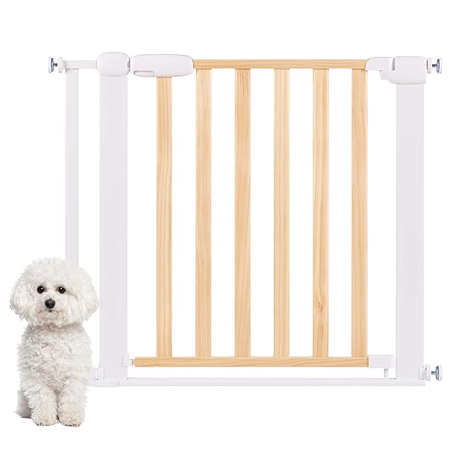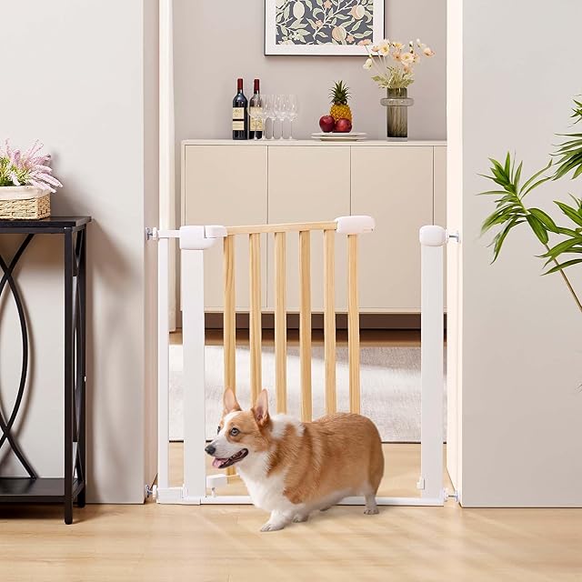 unipaws ペットゲート 天然木製 突っ張りタイプ 拡張可能 ホワイト 簡単取り付け 階段 出入り口用 自動開閉 高さ77cm 設置幅75-88cm 屋内 パーテーション 柵 バリア 玄関に ペットフェンス 小型犬 飛び出し防止 脱走防止 子犬に ロータイプ 犬用 ドア付き