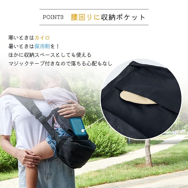 【腰ベルトで体への負担を軽減】人間工学に基づいた幅広腰ベルトが荷重を分散し、腰や肩への負担を軽減。長時間の抱っこも楽々。