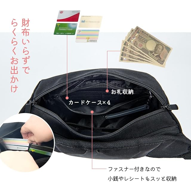 【収納力抜群の大容量ポケット】おむつ、スマホ、財布など必要なものがしっかり入る大容量収納付き。お財布機能+スキミング防止ポケットで防犯面も安心。