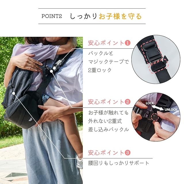 【二重ロックで安全性アップ】ベルト部分は二重ロック仕様で、抱っこ中のズレ落ちを防止。しっかり固定できるので外出時も安心して使用できます。