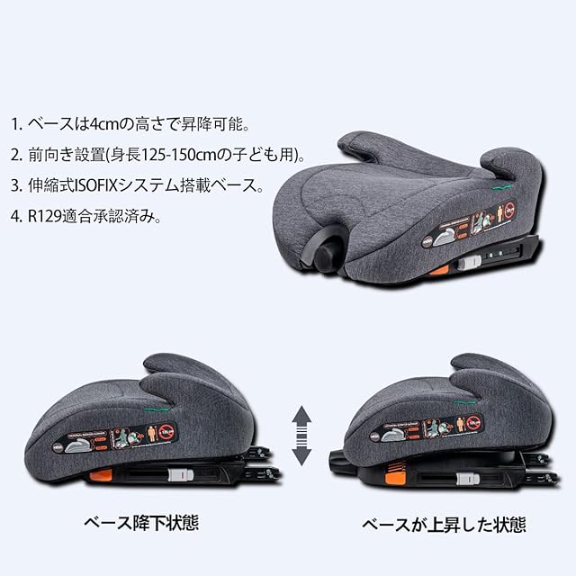 最新のEU規格: このキッズシートは、125~150cmのお子様用に設計されています。 このジュニアシートはヨーロッパのECE R129(I-SIZE)規格に準拠しており、従来のECE R44規格よりも厳しく、お子様をより確実に保護します。