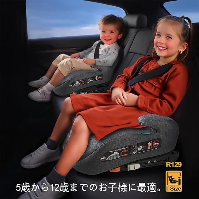 heekin ジュニアシート、ISOFIX、 高さ調節可能なチャイルドシート R129適合、125~150cm(5歳~12歳)のお子様に最適(ダークグレー)